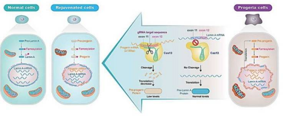 Progerie wird durch Mutationen im LMNA-Gen verursacht, die zur Ansammlung des abnormalen Proteins Progerin führen und die Zellalterung beschleunigen. Das einzige derzeit zugelassene Medikament, Lonafarnib, ist teuer und hat eine begrenzte Wirksamkeit. Es verlängert die durchschnittliche Lebenserwartung der Patienten nur um 2,5 Jahre. Kim Sun-wooks Team nutzte die neuartige RNA-gesteuerte RfxCas13d-Technologie, um pathogene RNA-Transkripte präzise zu spalten und gleichzeitig die normale Genfunktion zu erhalten.