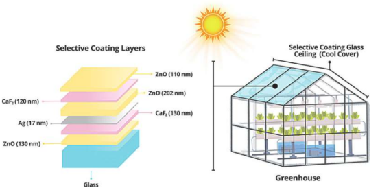 Die Folie besteht aus einem mehrschichtigen Aufbau aus Zinkoxid, Calciumfluorid und Silber. Simulationen zeigen, dass mit diesem Material beschichtetes Glas die Transmission von Nahinfrarotlicht um fast 90 % reduzieren kann, während die photosynthetisch aktive Strahlungsdurchlässigkeit bei etwa 51 % bleibt. Prognosen auf Basis eines Standard-Gewächshausmodells zeigen, dass diese Technologie den Energie- und Wasserverbrauch sowohl in heißen, trockenen Sommern als auch in milden Wintern effektiv senken kann, bei nur geringfügigen Ertragseinbußen.