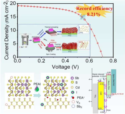 Experimentelle Ergebnisse zeigen, dass Phenylethylammoniumiodid die Oberflächenenergie von CdS reduziert und bevorzugt an der (211)-Kristallebene von Antimontrisulfid adsorbiert, was das orientierte Wachstum fördert und den Ladungsträgertransport verbessert. Das infiltrierte Phenylethylammoniumiodid erhöht die Ladungsträgerlebensdauer um das 3,7-fache und bestätigt damit seine effektive Defektunterdrückung. Mit dieser Technik hergestellte Antimontrisulfid-Heterojunction-Solarzellen erreichten einen Wirkungsgrad von 8,21 %.