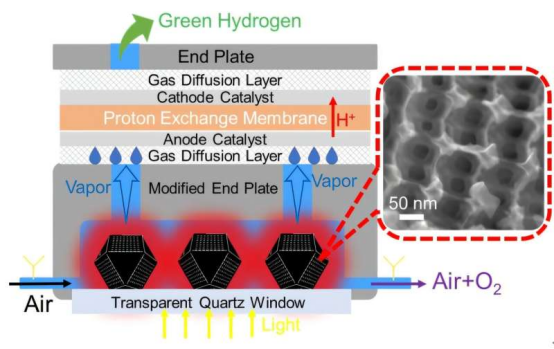 Die Protonenaustauschmembran-Wasserelektrolyse (PEMWE) ist ein führender Ansatz zur Erzeugung von grünem Wasserstoff und hat aufgrund ihrer hohen Effizienz und der hochreinen Wasserstoffproduktion große Aufmerksamkeit erregt. Die hohe Abhängigkeit des Prozesses von hochreinem Wasser schränkt jedoch seine Anwendung in wasserarmen Regionen ein. Die atmosphärische Wassergewinnung (AWH), eine neue Methode zur Gewinnung von reinem Wasser, bietet eine praktikable Lösung zur Bekämpfung der Wasserknappheit bei der Produktion von grünem Wasserstoff.