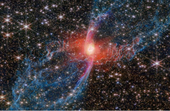 Der Rote Tarantelnebel, ein typisches Beispiel für einen sonnenähnlichen Stern in seinem späten Entwicklungsstadium, ist ein Nebelsystem, das aus einem heißen Zentralstern und einer Wolke aus ionisiertem Gas besteht. Daten des James-Webb-Weltraumteleskops zeigen, dass der Zentralstern dieses Nebels deutlich heißer ist als die umgebende Region und seine emittierte ultraviolette Strahlung das umgebende Gas zum Leuchten bringt. Die Analyse der Daten des Webb-Weltraumteleskops führte Astronomen zur Entdeckung der möglichen Existenz eines bisher unbeobachteten Begleitsterns im Zentrum des Nebels und liefert neue Hinweise zum Verständnis seiner einzigartigen Morphologie und Struktur.