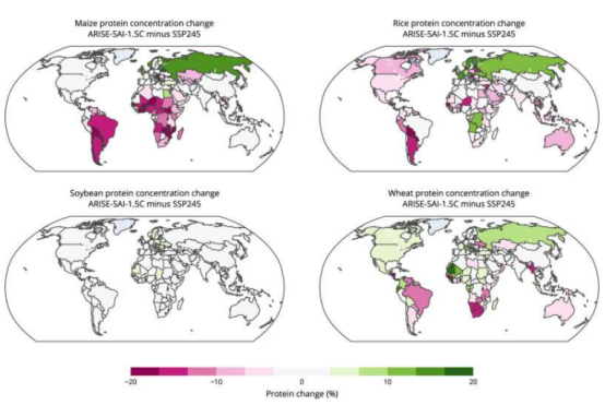 Simulationen zeigen, dass steigende Kohlendioxidkonzentrationen typischerweise den Proteingehalt von Nutzpflanzen verringern, während steigende Temperaturen diesen erhöhen. Stratosphärische Aerosol-Interventionstechniken dämpfen zwar die Erwärmung, stellen aber gleichzeitig sicher, dass die Auswirkungen des Kohlendioxids nicht durch steigende Temperaturen kompensiert werden. Erstautor Brendan Clark erklärte: „Stratosphärische Aerosol-Interventionstechniken können die Auswirkungen des Klimawandels nicht vollständig aufheben; sie schaffen einen neuen Klimazustand, in dem Kohlendioxid von der Oberflächentemperatur entkoppelt ist.“