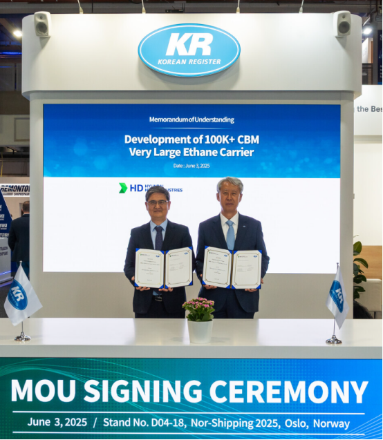 Am 3. Juni Ortszeit unterzeichneten HD Hyundai Heavy Industries und Korea Register (KR) auf der Veranstaltung „Nor-Shipping 2025“ in Oslo, Norwegen, eine Geschäftsvereinbarung (MOU) zur Entwicklung des Very Large Ethane Carrier (VLEC) der nächsten Generation.