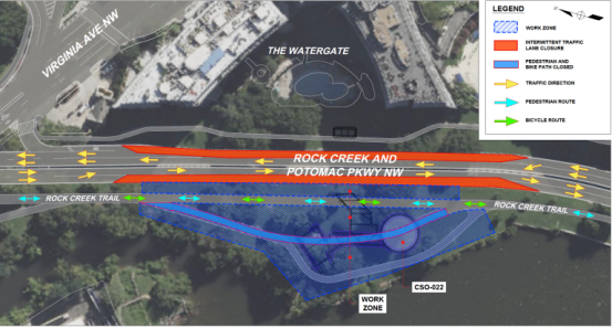 Auf der Baustelle entlang des Rock Creek Trail errichtet DC Water eine Umleitungsanlage, um den Abwassereinlass mit dem Potomac River Tunnel zu verbinden. Dazu gehören eine Umleitungskammer, ein Aquädukt, Bohrlöcher und Belüftungskomponenten.