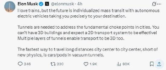 Als Antwort auf einen Beitrag über sein Tunnelbohrunternehmen The Boring Company sagte Musk: „Ich liebe Züge, aber die Zukunft liegt im personalisierten öffentlichen Nahverkehr, in dem autonome Elektrofahrzeuge Sie präzise an Ihr Ziel bringen. Tunnel werden benötigt, um grundlegende Engpässe in Städten zu lösen. Man kann keine dreidimensionalen Gebäude haben und erwarten, dass ein zweidimensionales Verkehrssystem funktioniert! Mehrschichtige Tunnel machen den Verkehr ebenfalls dreidimensional. Ohne neue Physik ist der schnellste Weg, lange Strecken von einer Stadt zur anderen zurückzulegen, ein Auto oder eine Kapsel in einem Vakuumtunnel zu fahren.“