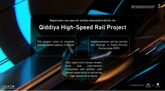 Am 22. September starteten die Royal Riyadh City Commission (RCRC), die Qiddiya Investment Company (QIC) und das National Center for Privatization and Public-Private Partnerships (NCP) gemeinsam einen Aufruf zur Interessenbekundung für das Qiddiya-Hochgeschwindigkeitsbahnprojekt. Die erste Phase wird nach einem PPP-Modell gebaut, die geplante Geschwindigkeit beträgt 250 km/h. Die Bewerbungsfrist läuft vom 22. September bis zum 12. Oktober, die Frist endet am 11. Oktober. Qualifizierte in- und ausländische Unternehmen können Registrierungsanträge einreichen und Absichtserklärungen per E-Mail an qhsr@rcrc.gov.sa erhalten.