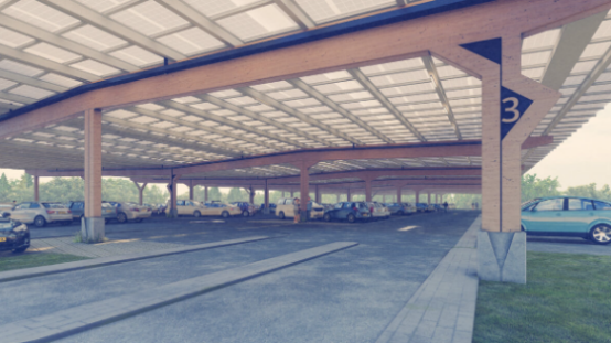 Dieser zwei Hektar große, kreisförmige Solarparkplatz wird nach seiner Fertigstellung der weltweit größte seiner Art sein. Er wird mit 5.304 kreisförmigen Solarmodulen der Firma Solarge ausgestattet sein und Platz für 925 Autos bieten. Die Tragkonstruktion besteht aus Holz und recyceltem Stahl. Unter dem Parkplatz befindet sich außerdem eine Ladestation, die nachts und an Wochenenden auch anderen Unternehmen zur Verfügung steht.