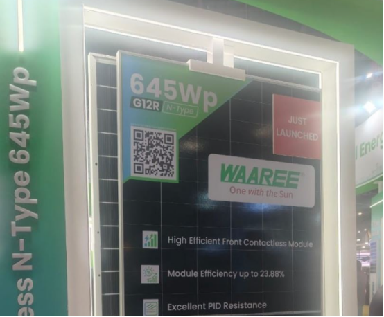 Waaree Energies präsentierte kürzlich ein neues Solarmodul mit rückseitiger Kontaktierung und TOPCon-Zelltechnologie. Das Modul gehört zur Tejomay-Serie, verwendet G12R-Zellen und erreicht einen Wirkungsgrad von 23,88 %.